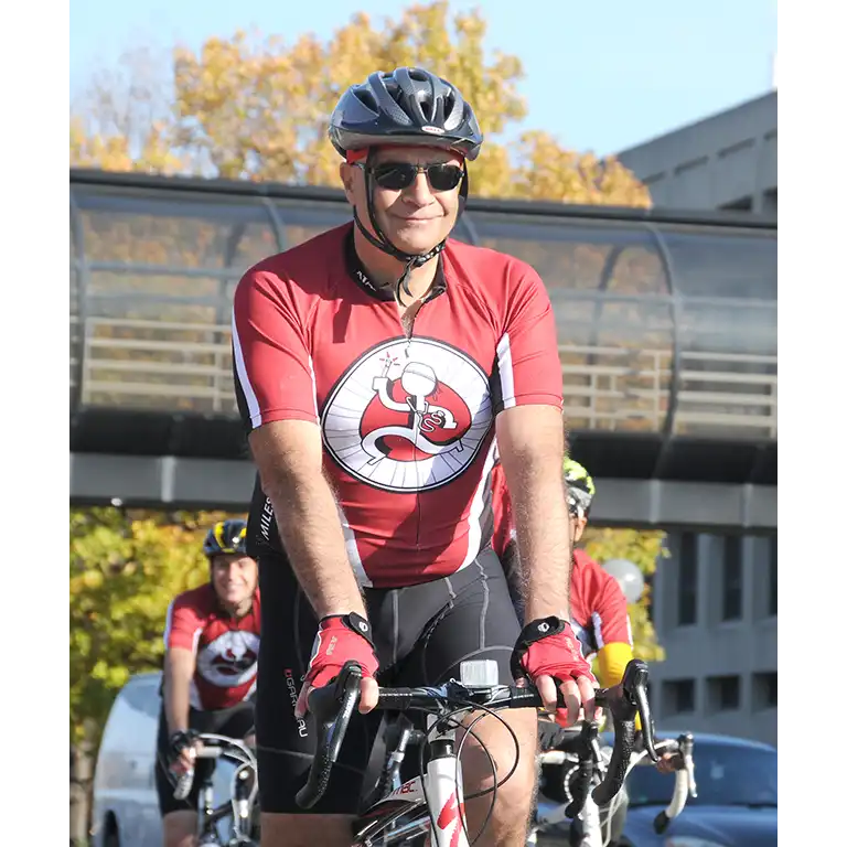 As part of his treatment regimen, Greg had two stem cell transplants. “When I had my second one, this tall dude with cool glasses walked in,” he said. “That’s the first time I met Dr. Abonour. We started talking about biking — which was something we both loved to do — and I’ve been his patient ever since.”