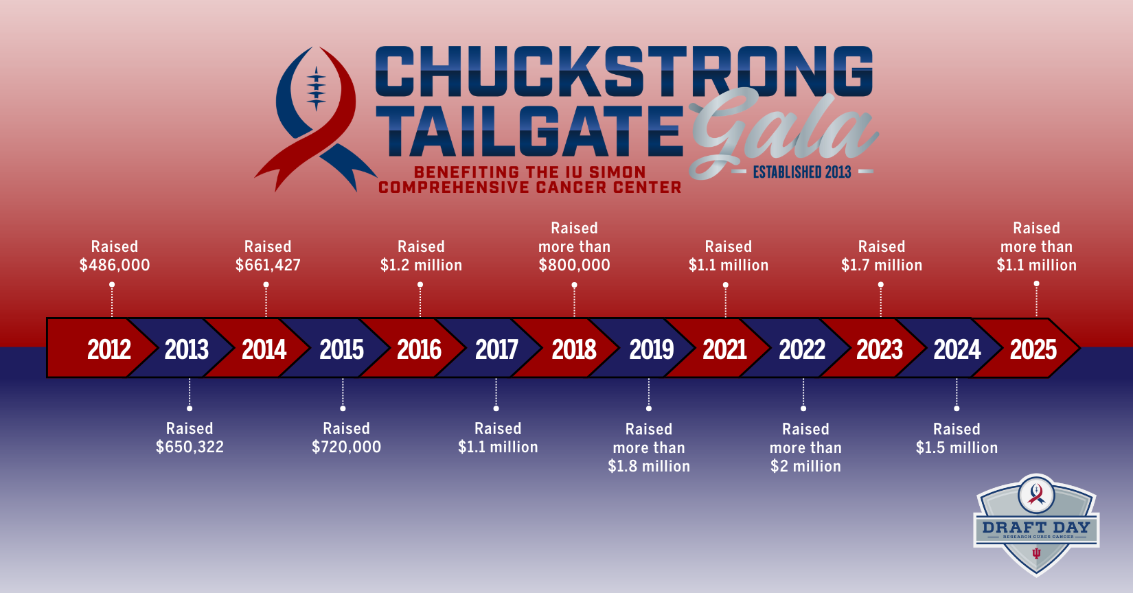 Hosted by Indianapolis Colts owner Jim Irsay and his family and former Colts head coach Chuck Pagano on April 11 at the Indiana Farm Bureau Football Center, the 2025 Chuckstrong Tailgate Gala brought total giving to more than $16 million for cancer research since the Chuckstrong initiative launched in 2012.