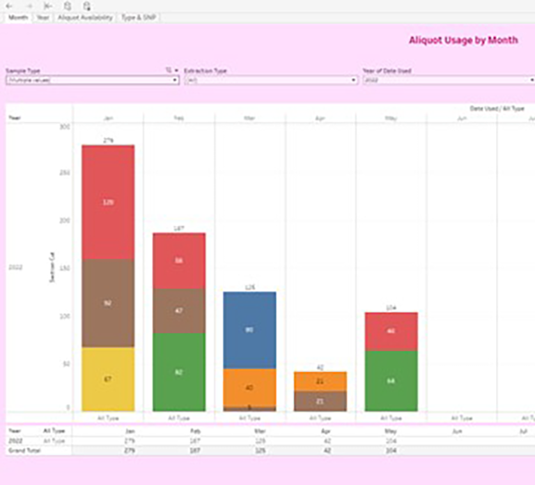 The Aliquot Usage by Type report reveals the number of samples dispatched monthly and yearly. It illustrates the usage of aliquots according to both sample type and extraction type across a given time period, whether it be a month or a year. The report also provides a visual representation of the usage of aliquots based on genetic ancestry over several years. To check for aliquot availability, the report offers interactive filters such as used year, sample type, extraction type, cellularity, and SNP categories.