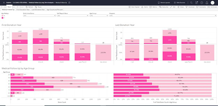 The Medical Follow-up Long-Term Analysis report examines the completion rates of medical follow-ups among different groups. It reveals that recently registered donors are more inclined to complete their medical follow-up annually, while donors in their 60s and 70s demonstrate the highest rate of submitting their medical follow-up.