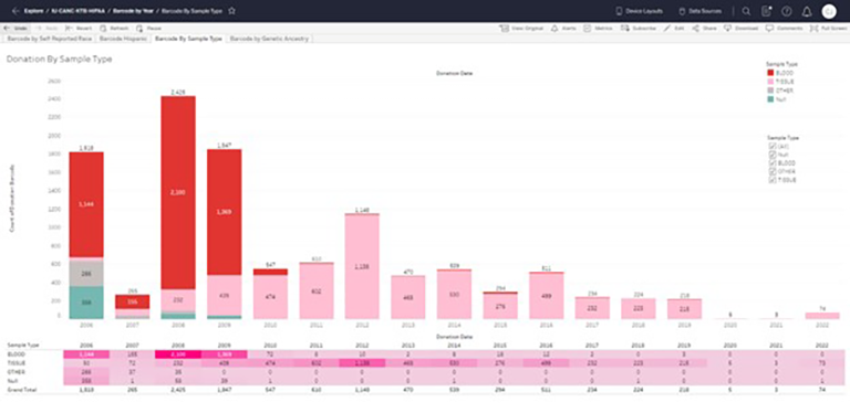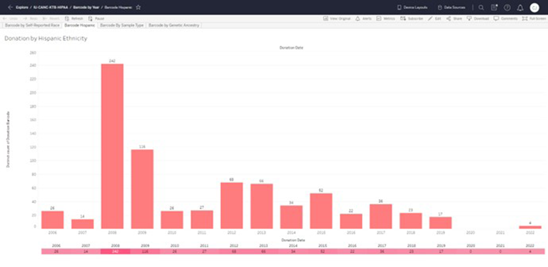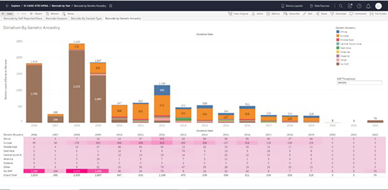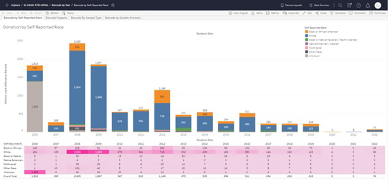 The Donation by Year report offers a comprehensive summary of our donation data spanning multiple years. It includes information on the donations made by individuals of varying race, ethnicity, and genetic ancestry. Furthermore, the report displays the donations based on sample type, specifically differentiating between blood and tissue donations, over a range of years.