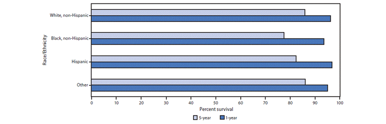 Relative 1-year and 5-year survival of male breast cancer patients, by race/ethnicity— United States, 2007–2016